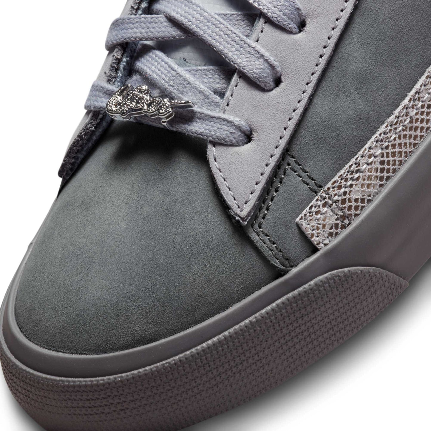 Established in 1993, Japanese streetwear brand FPAR (which stands for "Forty Percent Against Rights") is renown for pushing against traditional forms of media and infusing its creations with its defiant, DIY ethos. Their latest collaboration with Nike SB is no exception. A mixed and matched masterpiece, the Nike SB Zoom Blazer Low has a star-texture on the toe, a snake print overlay in the ollie zone and a sparkling dubrae on each shoe—all in a super premium, plush suede package.